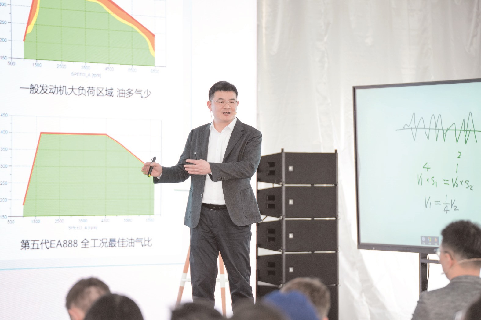 在白板上“手搓公式”,给大家讲解第五代EA888发动机的陶海龙,很有一种“重回工程师”的感觉,讲性正酣的他,还以用户思维“扪心自问”了一句:“通过这个技术,带来了什么客户价值呢?”