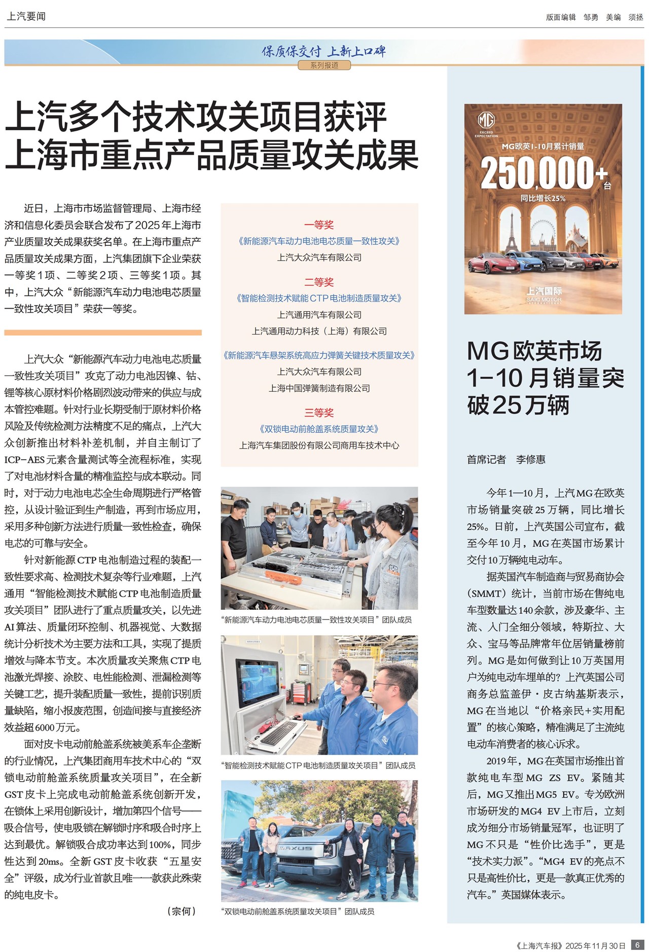 上汽多个技术攻关项目获评上海市重点产品质量攻关成果