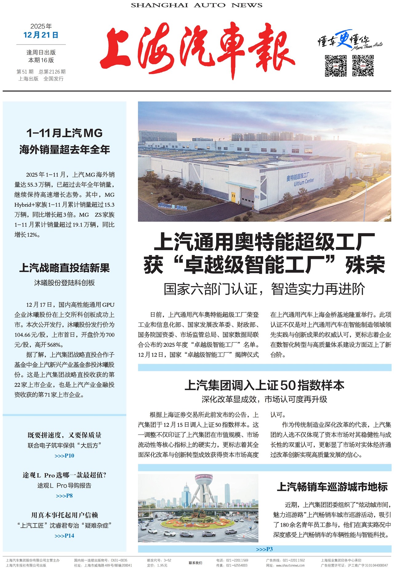 上海汽车报首页 上汽通用奥特能超级工厂获“卓越级智能工厂”殊荣 上汽集团调入上证50指数样本 上汽畅销车巡游城市地标 1-11月上汽MG海外销量超去年全年 上汽战略直投结新果
