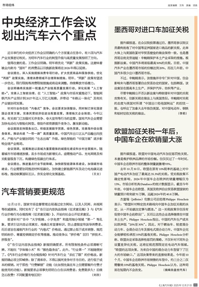 近日举行的中央经济工作会议明确的八个方面重点任务中,有六项与汽车产业发展密切相关,为明年汽车行业的转型升级与高质量发展指明了方向。
