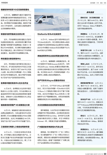 东风日产N6 12月1日上市,售价9.99万~12.99万元。搭载东风日产与Momenta深度定制驾驶辅助方案,可实现高速领航辅助NOA、城市记忆领航辅助等功能。