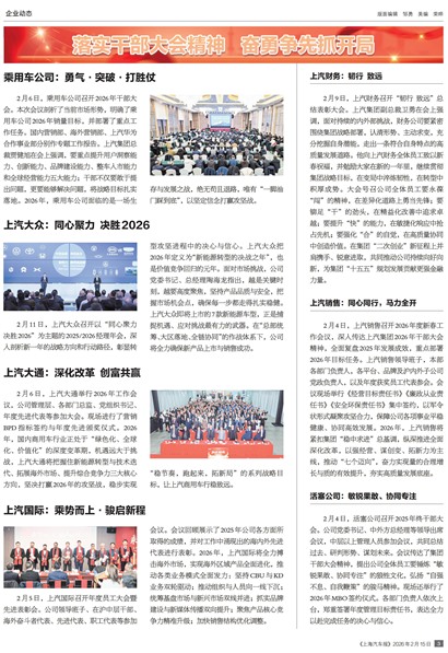 2月9日,上汽财务召开“韧行 致远”总结表彰大会。上汽集团副总裁卫勇在会上强调,面对持续的内外部挑战,财务公司要紧密围绕集团战略部署,认清形势、主动求变,充分挖掘自身潜能,走出一条符合自身特点的高质量发展道路。他向上汽财务全体员工致以新春祝福,并勉励大家在新的一年里,继续贯彻集团战略目标,在变局中淬炼韧性,在转型中积厚成势。大会号召公司全体员工要永葆“闯”的精神,在差异化道路上勇当先锋;要铆足“干”的劲头,在精益化改善中追求卓越;要提升“快”的能力,在敏捷化响应中抢占先机;要强化“合”的自觉,在高质量协同中创造价值。在集团“二次创业”新征程上并肩携手、锐意进取,共同推动公司持续向好向新,为集团“十五五”规划发展贡献更强金融力量。