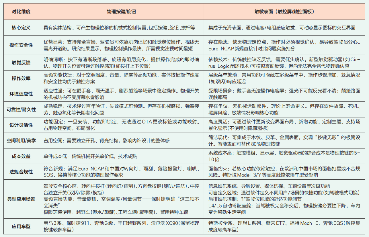 Euro NCAP和中国新车评价规范同步收紧,物理按键与触敏表面的优劣之争已从用户体验层面上升到安全合规层面。以下是基于最新法规和技术发展的详细对比分析: