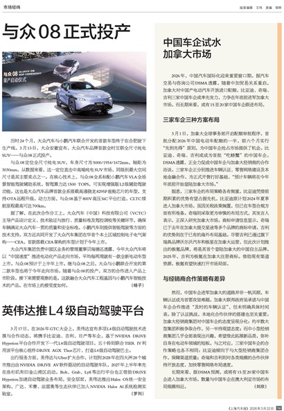 3月17日,在2026年GTC大会上,英伟达宣布多项L4级自动驾驶技术进展与合作动态,将携手比亚迪、吉利、日产等车企,基于NVIDIA DRIVE Hyperion平台合作开发下一代L4级自动驾驶项目。五十铃则联合TIER IV利用该平台核心组件DRIVE AGX Thor芯片,打造L4级自动驾驶巴士。
