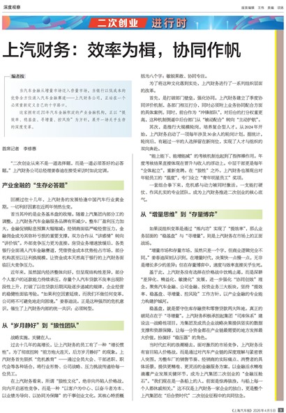 当时代红利的浪潮褪去,面对激烈的市场竞争,上汽财务没有盲目陷入价格战,而是通过对汽车产业链的深度理解与紧密嵌入突围,为整车厂的销售节奏、经销商的实际痛点、消费者的具体场景,提供更精准、更灵活的金融服务方案,以金融活水精准滴灌产业发展关键环节,成为上汽集团二次创业的“金融压舱石”。“我们现在是一条船上的人,前面是惊涛骇浪,与船上每一个人都休戚相关。”这不仅是上汽财务一家企业的独白,更是整个上汽集团在“后合资时代”二次创业征程中的共同信念。